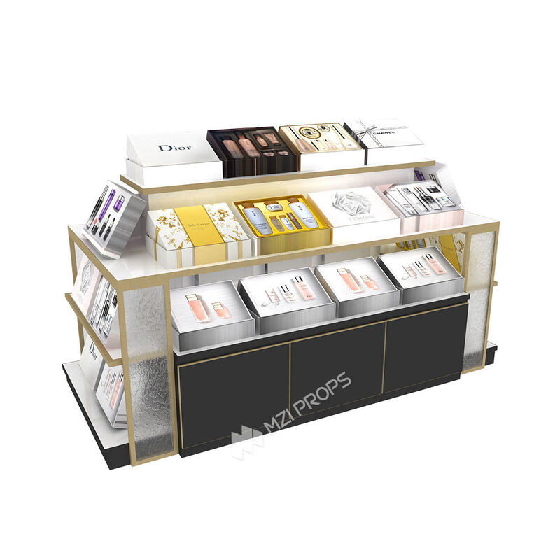 Esta exposição de cosméticos adota principalmente uma estrutura de tubo de ferro quadrado de 30 * 15 mm, pulverizada com tinta dourada e brilhante, e uma estrutura geral de placa laminada preta.Criando um efeito de exibição moderno e simples.