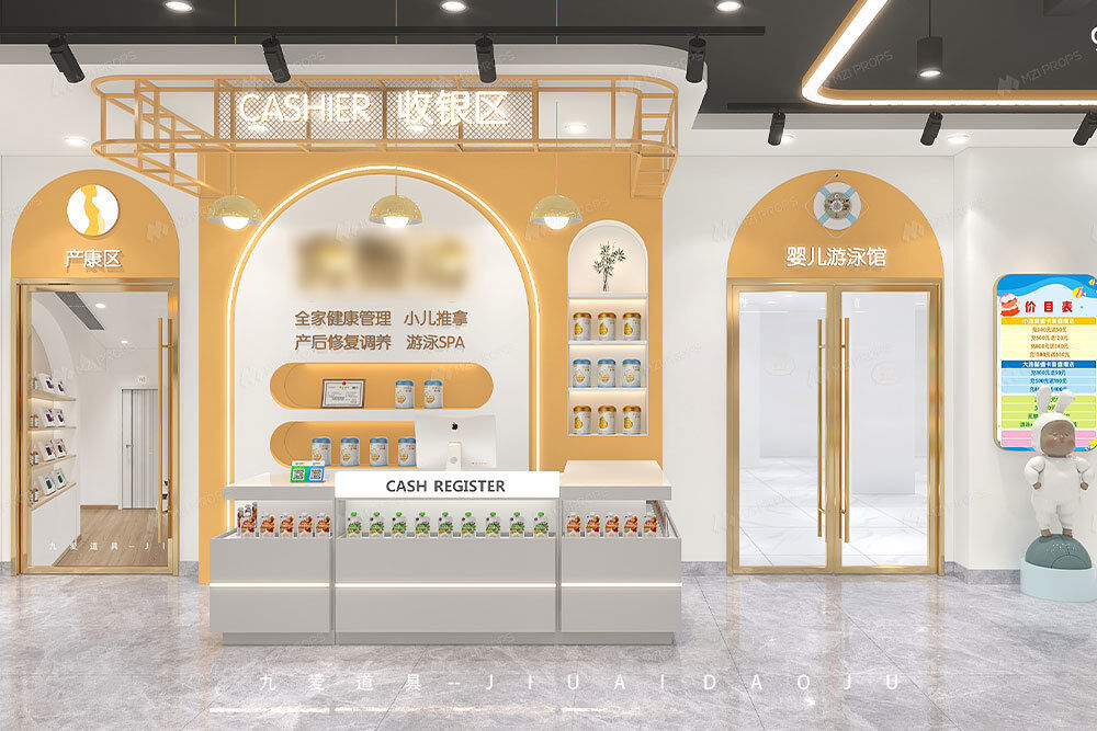 Using High-Quality Gray And White Unpainted Solid Wood Particle Boards, Gray Aluminum Plastic Edging Strips, Orange Powder-Coated Iron, Black And White Unpainted Boards, Combined With Acrylic Glowing Logos And Efficient LED Lighting Systems, Creates A Korean Cream Style Maternal And Child Shop Environment